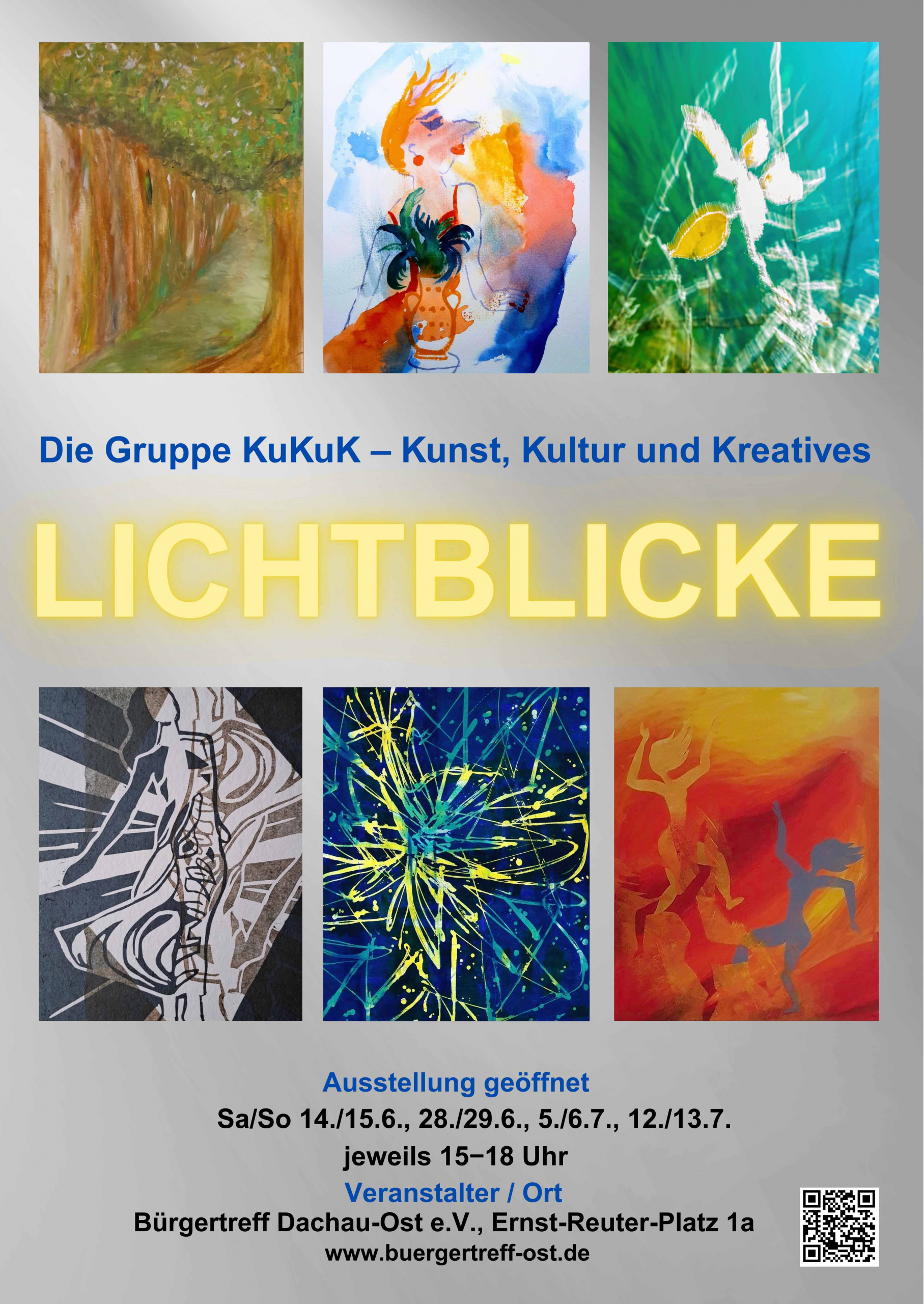 Wer im Moment Nachrichten zur aktuellen Weltlage hört oder sieht, hat allen Anlass besorgt, verängstigt oder gar depressiv zu werden. Die Sommerausstellung von Mitgliedern der Gruppe KuKuK (Kunst, Kultur und Kreatives) möchte mit „Lichtblicke“ die triste Stimmung vertreiben und für den Moment – und darüber hinaus – den Blick für die schönen Seiten öffnen und etwas Leichtigkeit und Heiterkeit verbreiten. Statt der heraufbeschworenen düsteren Zeitenwende also leuchtende Seitenwände in der Galerie im Bürgertreff Ost e.V. Dazu tragen Claudia Berger-Jenker, Christiane Billhardt, Ursula Dangl, Ruth Haunert, Lise Plisson, Rosie Till und Carin Szostecki mit ihren Arbeiten bei.